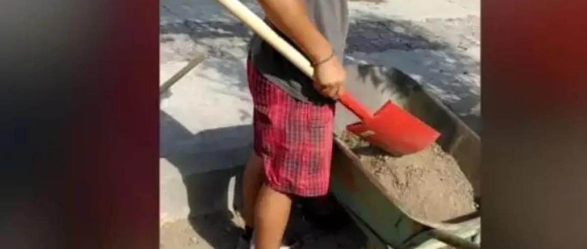 Ένα Α' Γυμνασίου με φτυάρι κάνει αγροτικές δουλειές στη δομή της «Κιβωτού», ενώ ένα άλλο φανερά εξουθενωμένο από τη δουλειά μετά βίας μπορεί να σηκώσει το φτυάρι.