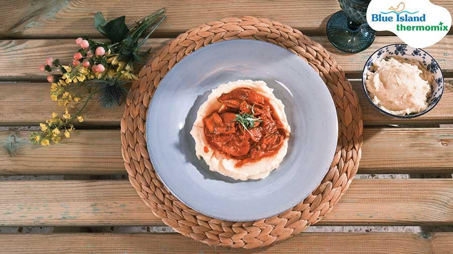 Σερβίρετε τα κοκκινιστά καλαμαράκια με τον πουρέ πατάτας ζεστά