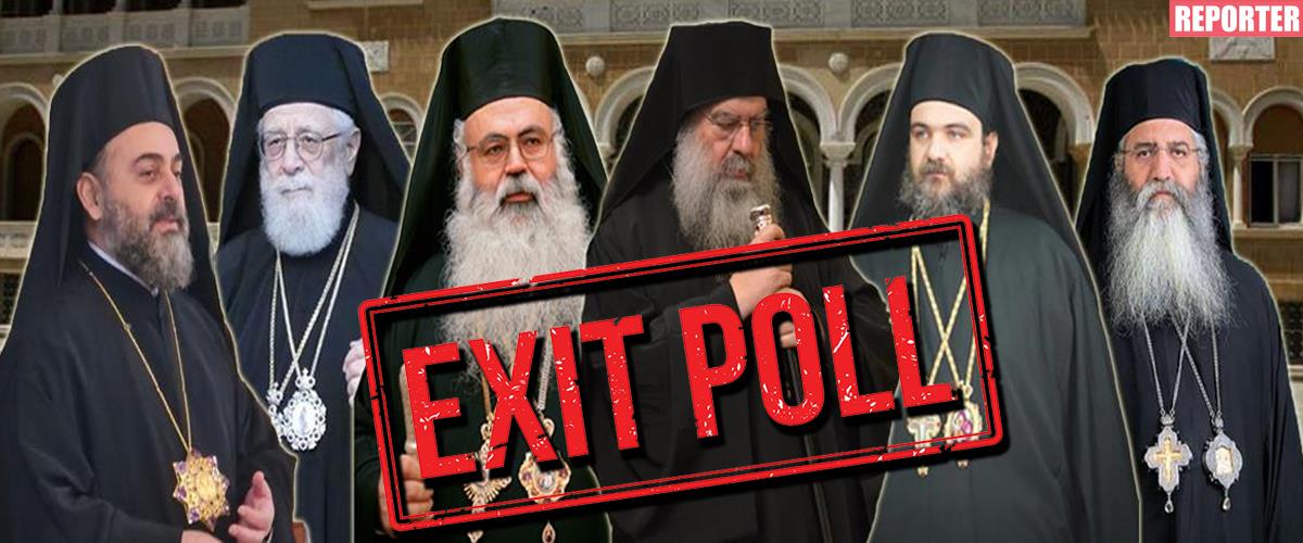 Σύμφωνα με το exit poll του Αλφα o Μητροπολίτης Λεμεσού Αθανάσιος προηγείται με ποσοστό 41,2%-36,2%, ακολουθεί ο Μητροπολίτης Ταμασού Ησαϊας με 20,1%-16,1% ενώ την τριάδα συμπληρώνει ο Μητροπολίτης Πάφου Γεώργιος με 19,6%-15,6%. Εντός του στατιστικού λάθους ακολουθεί στην τέταρτη θέση ο Μητροπολίτης Κωνσταντίας Βασίλειος με 17,8%-13,8%. Ο Μόρφου Νεόφυτος ακολουθεί με 7,8%-4,8%, ενώ στην τελευταία θέση είναι ο Μητροπολίτης Κυρηνείας Χρυσόστομος με 4,6%-2,6%.