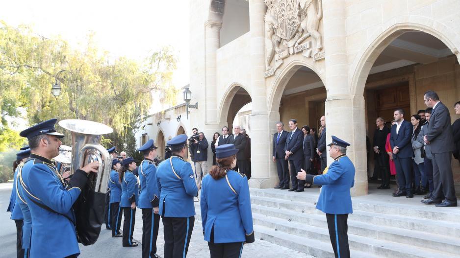 Ο Πρόεδρος της Δημοκρατίας Νίκος Αναστασιάδης άκουσε την Παρασκευή, στο Προεδρικό Μέγαρο, τα Κάλαντα από τις φιλαρμονικές της Εθνικής Φρουράς, της ΕΛΔΥΚ και της Αστυνομίας.
