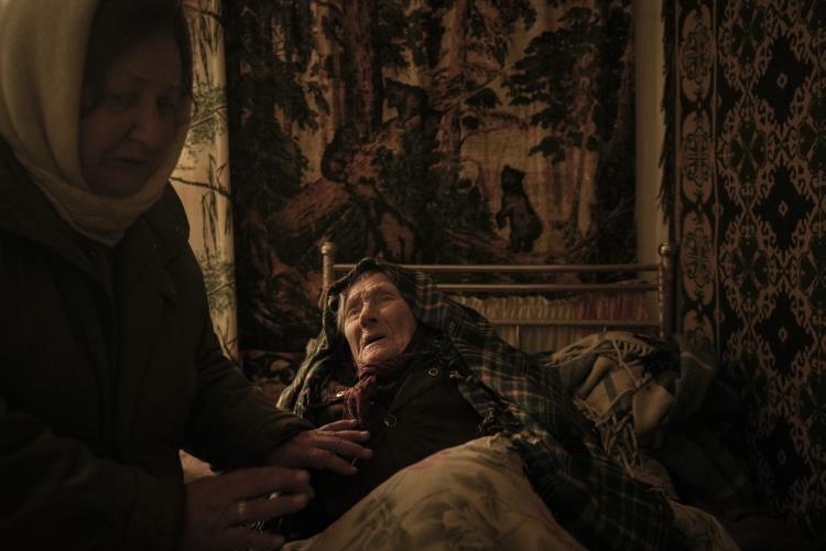 Η Motria Oleksiienko, 99 ετών και τραυματισμένη από τη ρωσική εισβολή, παρηγορείται από τη νύφη της, Tetiana Oleksiienko, σε ένα δωμάτιο χωρίς θέρμανση στο χωριό Andriivka της Ουκρανίας, καθώς συνεχίζονται σφοδρές μάχες μεταξύ των ρωσικών και των ουκρανικών δυνάμεων. 6 Απριλίου 2022.