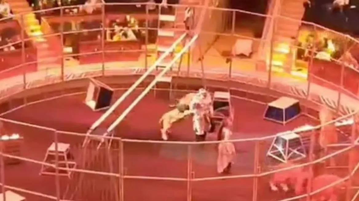 Στο βίντεο φαίνεται το λιοντάρι να αρπάζει από την πλάτη τον Μακαρένκο ενώ στις θέσεις των θεατών βρίσκονται παιδιά και οι γονείς τους.