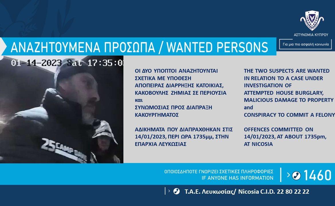 Παρακαλείται οποιοσδήποτε γνωρίζει οτιδήποτε που μπορεί να βοηθήσει στην αναγνώριση και εντοπισμό των δύο αναζητούμενων προσώπων, να επικοινωνήσει με το ΤΑΕ Λευκωσίας, στο τηλέφωνο 22-802222 ή με τη Γραμμή του Πολίτη, στον τηλεφωνικό αριθμό 1460 ή με τον πλησιέστερο Αστυνομικό Σταθμό.