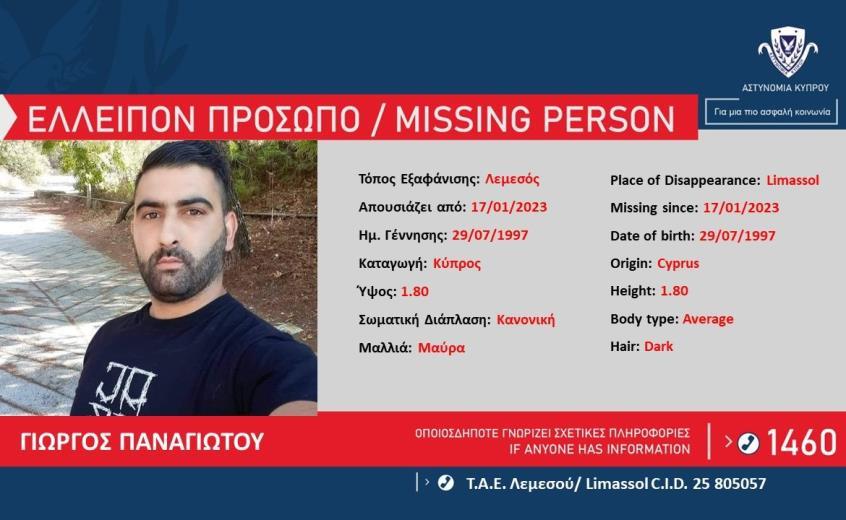 Σε εξέλιξη βρίσκεται επιχείρηση της Αστυνομίας σε σχέση με την εξαφάνιση του Γιώργου Παναγιώτου, 25 ετών, ο οποίος απουσιάζει από την οικία του στο Μονάγρι, από τα ξημερώματα σήμερα 17/01/2023.