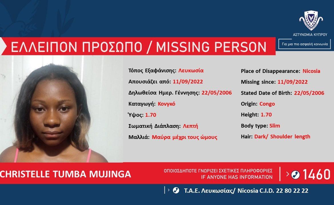 Τη φωτογραφία και τα στοιχεία 16χρονης, η οποία ελλείπει από τον χώρο διαμονής της στη Λευκωσία, δίνει στη δημοσιότητα η Αστυνομία, με σκοπό τη συλλογή πληροφοριών που μπορεί να βοηθήσουν στον εντοπισμό της.