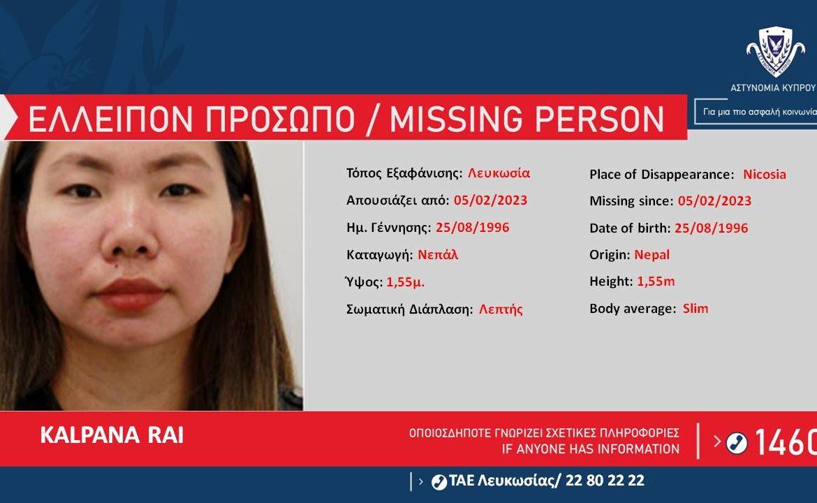 Η Αστυνομία ζητά πληροφορίες που μπορούν να βοηθήσουν στον εντοπισμό της KALPANA RAI, 26 ετών, από το Νεπάλ, η οποία απουσιάζει από τον χώρο διαμονής της στη Λευκωσία, από τις 05/02/2023.