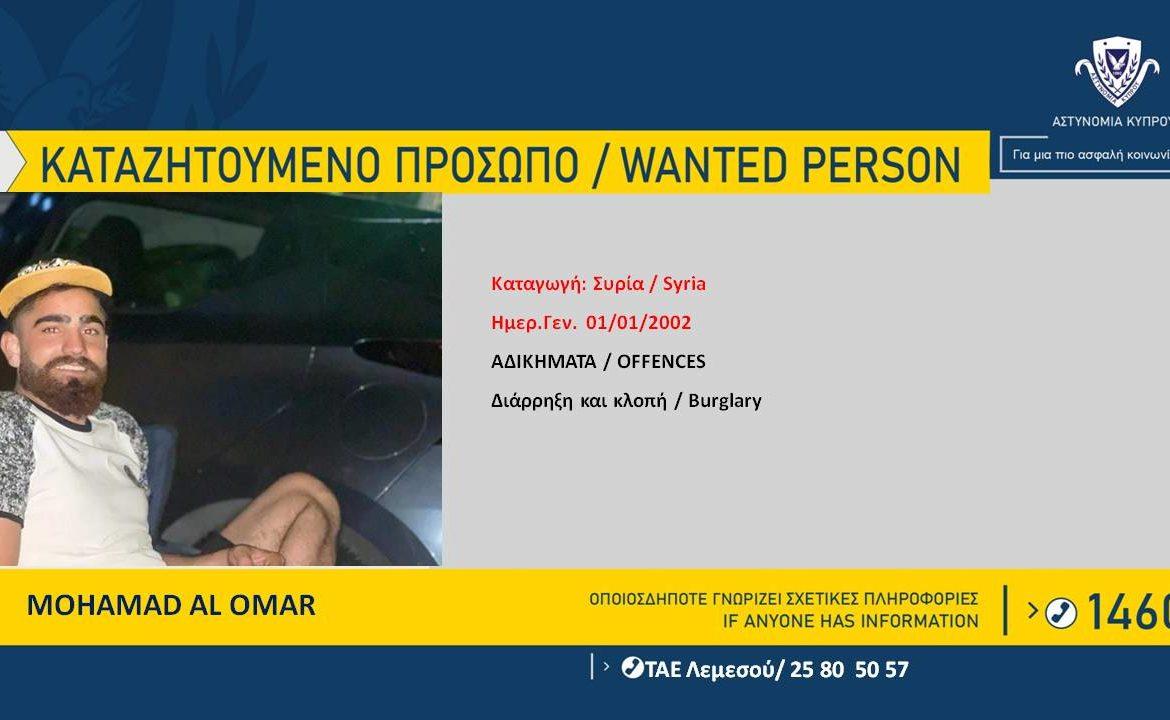 Η Αστυνομία καταζητεί τον MOHAMAD AL OMAR, 21 ετών, από τη Συρία, για διευκόλυνση των ανακρίσεων, σχετικά με διερευνώμενη υπόθεση διάρρηξης αποθήκης και κλοπής (ζάντες οχημάτων αξίας 11,000 ευρώ), αδίκημα το οποίο διαπράχθηκε στις 28/12/2022, στην επαρχία Λεμεσού.