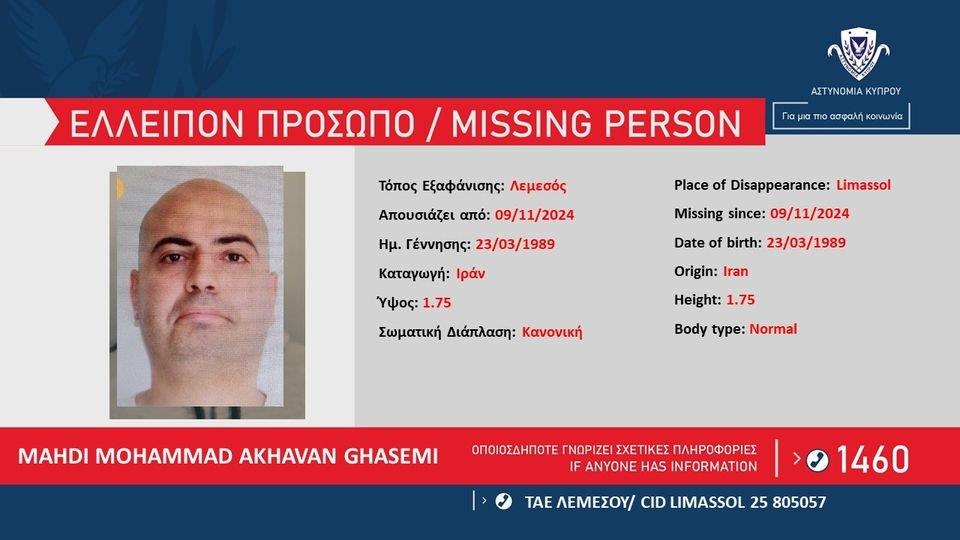 Η Αστυνομία ζητά πληροφορίες για εντοπισμό του MAHDI MOHAMMAD AKHAVAN GHASEMI, 35 ετών από το Ιράν, ο οποίος απουσιάζει από τον χώρο διαμονής του στη Λεμεσό από τις 9/11/2024.