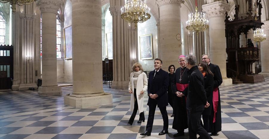 Οκτώ ημέρες πριν από την επαναλειτουργία της Παναγίας των Παρισίων, ο Εμανουέλ Μακρόν βρέθηκε στο εσωτερικό του κτιρίου έχοντας στο πλευρό του την Πρώτη Κυρία της Γαλλίας, Μπριζίτ Μακρόν, τη δήμαρχο της «πόλης του φωτός» Αν Ινταλγκό και τον αρχιτέκτονα που σχεδίασε στην εξωτερική πλατεία.