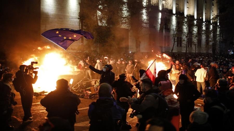 Η αστυνομία της Γεωργίας έκανε χρήση δακρυγόνων και εκτοξευτήρων νερού για να επιχειρήσει να διαλύσει διαδηλωτές, οι οποίοι διαμαρτύρονταν μέχρι τις πρώτες πρωινές ώρες εναντίον της απόφασης της κυβέρνησης να καθυστερήσει μέχρι το 2028 τις διαπραγματεύσεις για την ένταξη της χώρας στην Ευρωπαϊκή Ένωση.