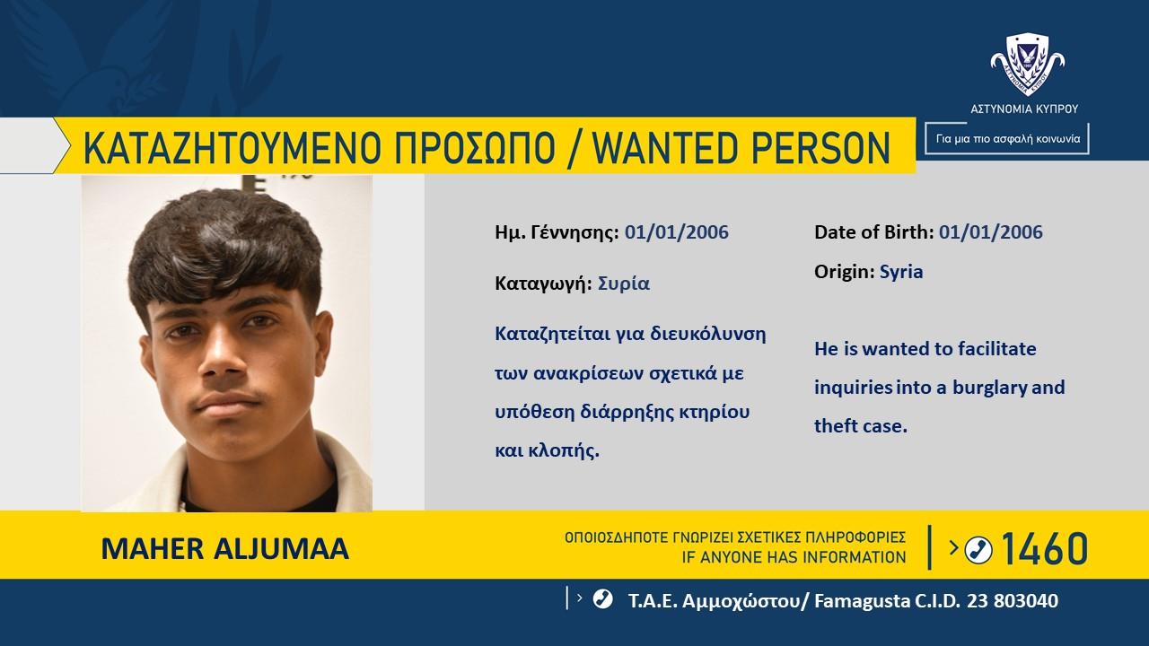 Η Αστυνομία ζητά πληροφορίες που μπορούν να βοηθήσουν στον εντοπισμό του Maher Aljumaa, 18 ετών, από τη Συρία, εναντίον του οποίου εκκρεμεί δικαστικό ένταλμα σύλληψης για διευκόλυνση των ανακρίσεων, σχετικά με διερευνώμενη υπόθεση διάρρηξης κτηρίου και κλοπής, που διαπράχθηκε στην Αγία Νάπα στις 11 Νοεμβρίου 2024.
