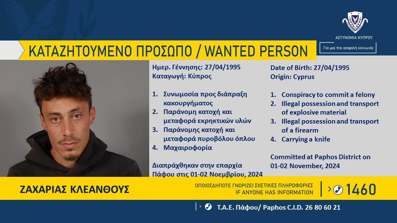 Τα στοιχεία και φωτογραφία άντρα ηλικίας 29 ετών, ο οποίος καταζητείται σε σχέση με διερευνώμενη υπόθεση 1. Συνωμοσίας προς διάπραξη κακουργήματος, 2. Κατοχής και μεταφοράς εκρηκτικών υλών, 3, Κατοχής και μεταφοράς πυροβόλου όπλου, και 4. Μαχαιροφορίας, που διαπράχθηκαν στις 01-02 Νοεμβρίου, 2024, στην επαρχία Πάφου, δίνει στη δημοσιότητα η Αστυνομία, με σκοπό τη συλλογή πληροφοριών που μπορεί να οδηγήσουν στον εντοπισμό του.