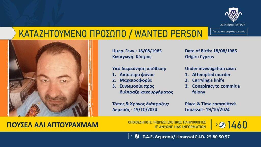 Πρόκειται για τον Μεχμέτ Νικόλα Μεχμέτ, ημερομηνία γέννησης 26/05/1997, από Λεμεσό, εναντίον του οποίου έχει εκδοθεί δικαστικό ένταλμα σύλληψης, για σκοπούς διερεύνησης της υπόθεσης.