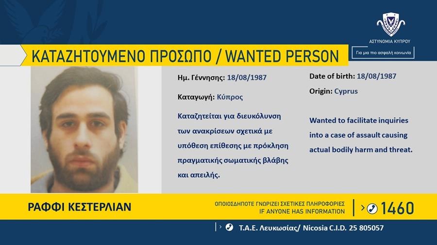 Η Αστυνομία ζητά πληροφορίες που μπορούν να βοηθήσουν στον εντοπισμό του ΡΑΦΦΙ ΚΕΣΤΕΡΛΙΑΝ, 37 ετών, εναντίον του οποίου εκκρεμεί δικαστικό ένταλμα σύλληψης, για διευκόλυνση των ανακρίσεων σχετικά με διερευνώμενη υπόθεση επίθεσης με πρόκληση πραγματικής βλάβης και απειλής, που διαπράχθηκαν στη Λευκωσία, μεταξύ Σεπτεμβρίου και 13 Οκτωβρίου 2024.
