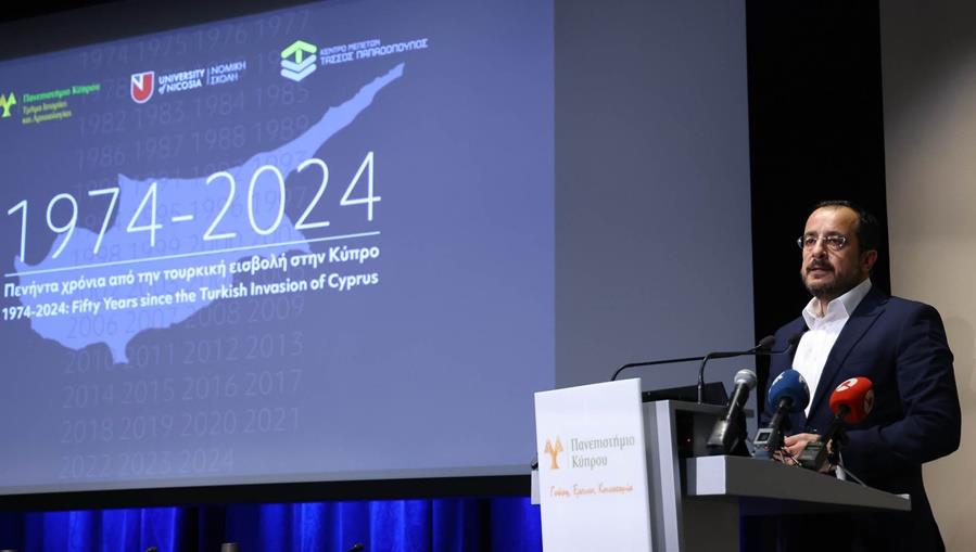 Σε χαιρετισμό του κατά την τελετή έναρξης του συνεδρίου «1974-2024. Πενήντα χρόνια από την τουρκική εισβολή στην Κύπρο», στο Πανεπιστημίο Κύπρου, σημείωσε ότι η συμπλήρωση πενήντα χρόνων από το πραξικόπημα και την τουρκική εισβολή αποτελεί ορόσημο για απολογισμούς και αναγκαίες αποτιμήσεις.