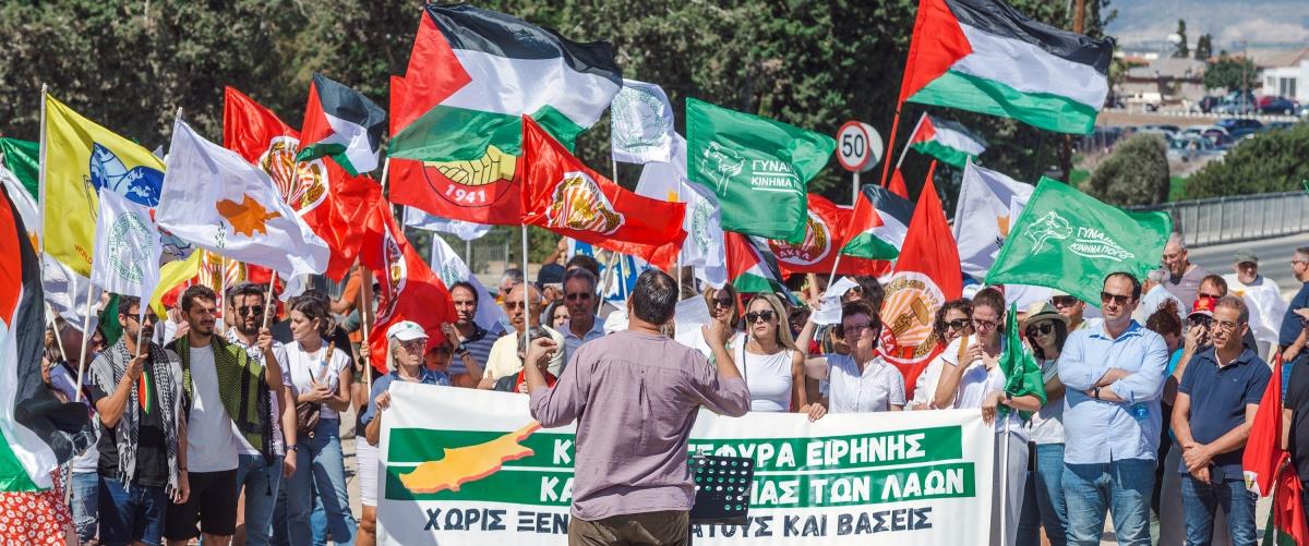 Εκ μέρους της οργάνωσης United for Palestine Cyprus, την αντιπολεμική διαμαρτυρία χαιρέτισε ο Μάρκος Οικονόμου, ο οποίος ανέφερε ότι οι Βρετανικές Βάσεις δεν είναι το μοναδικό «δολοφονικό εργαλείο» στην Κύπρο, αφού, όπως υποστήριξε, «η κυπριακή Κυβέρνηση είναι δεσμευμένη με συμφωνία στρατιωτικής φύσης να στηρίζει το Ισραήλ».