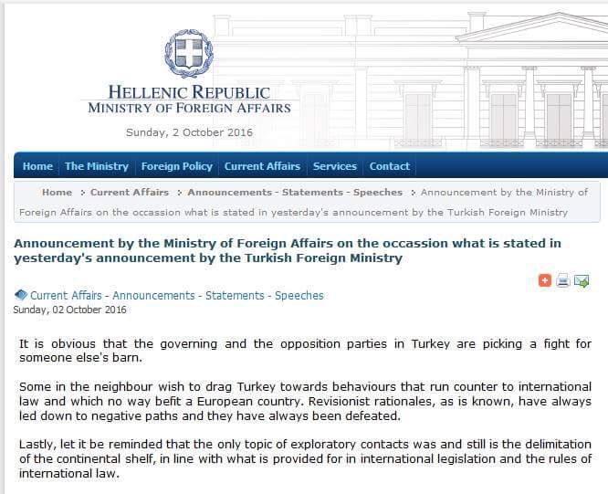 Τέλος, υπενθυμίζουμε ότι το μοναδικό αντικείμενο των διερευνητικών επαφών ήταν και είναι η οριοθέτηση της υφαλοκρηπίδας, σύμφωνα με τις προβλέψεις και τους κανόνες του διεθνούς δικαίου».