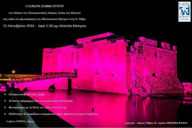 Στο πλαίσιο της Πανευρωπαϊκής Ημέρας Υγείας του Μαστού, η Εuropa Donna Κύπρου διοργανώνει το Σάββατο το απόγευμα εκδήλωση φωταγώγησης του Μεσαιωνικού κάστρου στην Κάτω Πάφο, κατά την οποία εθελόντριες θα μοιράσουν ενημερωτικό υλικό.