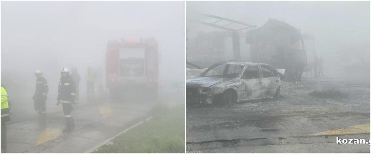 Εκείνη τη στιγμή ο οδηγός του δεύτερου αυτοκίνητο που ακολουθούσε, λόγω της ομίχλης δεν πρόλαβε να φρενάρει και έπεσε πάνω στο αυτοκίνητο που έκανε όπισθεν. Από τη σύγκρουση ξέσπασε αμέσως φωτιά και δύο άνθρωποι που επέβαιναν στα αυτοκίνητα απανθρακώθηκαν. Ελάχιστα λεπτά αργότερα, η νταλίκα που ακολουθούσε τα δύο αυτοκίνητα έπεσε πάνω τους για να καταλήξει στο κουβούκλιο των διοδίων και να τυλιχτεί επίσης στις φλόγες. Τέσσερις άνθρωποι έχουν τραυματισθεί και σύμφωνα με τις πληροφορίες που υπάρχουν έως τώρα, δεν κινδυνεύουν.