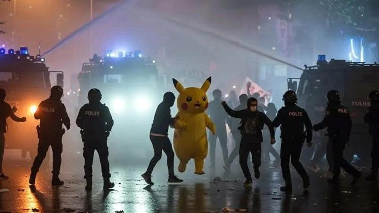 Ο Πίκατσου εμφανίζεται να τρέχει ανάμεσα στο πλήθος λίγο αφότου οι τουρκικές Αρχές άρχισαν να εκτοξεύουν νερό για να διαλύσουν τη διαδήλωση.