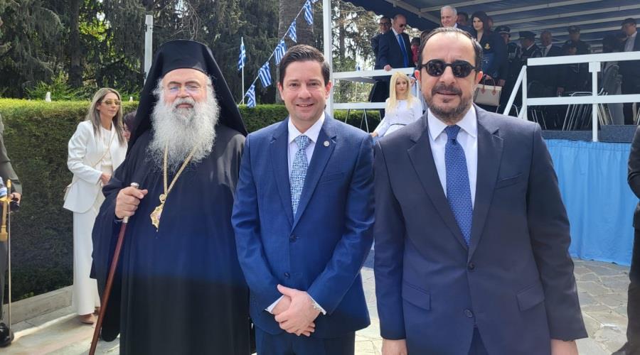 Στην Πανηγυρική Δοξολογία που τελέστηκε στον Ιερό Ναό Παναγίας Φανερωμένης στη Λευκωσία, στις 10:00 το πρωί, χοροστατούντος του Μακαριώτατου Αρχιεπισκόπου Κύπρου κ.κ. Γεωργίου, με την παρουσία του Προέδρου της Δημοκρατίας κ. Νίκου Χριστοδουλίδη, o Πρύτανης του Εθνικού Καποδιστριακού Πανεπιστημίου Αθηνών Καθηγητής Γεράσιμος Σιάσος, εκφώνησε τον πανηγυρικό της ημέρας για την επέτειο της 25ης Μαρτίου.