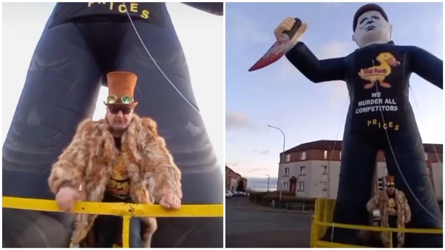 Ένας Σκωτσέζος επιχειρηματίας θέλησε να προωθήσει την επιχείρησή του με έναν πρωτότυπο – αλλά εξαιρετικά ατυχές – τρόπο. Παρήγγειλε μια πλαστική κούκλα ύψους 10 μέτρων, εμπνευσμένη από τον χαρακτήρα Mike Myers της ταινίας τρόμου «Halloween», κρατώντας ένα ματωμένο μαχαίρι και φορώντας μπλούζα που έγραφε: «Δολοφονήσαμε όλους τους ανταγωνιστές… στις τιμές».