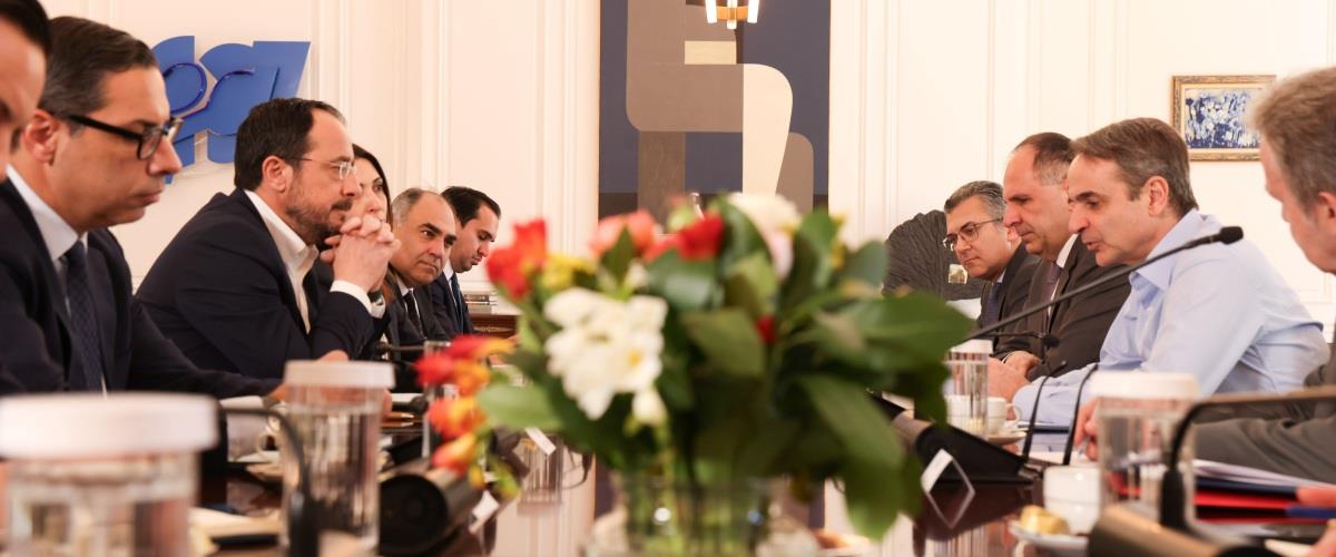 Καλωσορίζοντας τον Πρόεδρο της Δημοκρατίας, ο κ. Μητσοτάκης ανέφερε: «Βρισκόμαστε ενόψει μίας εξαιρετικά κρίσιμης γεωπολιτικής συγκυρίας. Σε ό,τι αφορά την ήπειρο μας, πριν από δύο ημέρες συμμετείχαμε σε ένα εξαιρετικά σημαντικό Ευρωπαϊκό Συμβούλιο, το οποίο επιβεβαίωσε πάγιες θέσεις της Ελλάδας και της Κύπρου σχετικά με την ανάγκη η Ευρώπη ως Ευρωπαϊκή Ένωση, αλλά και τα κράτη μέλη να επενδύσουμε περισσότερο στην άμυνά μας, με συμπεράσματα, τα οποία μας καλύπτουν απόλυτα, με αναφορά στην ανάγκη προστασίας όλων των συνόρων της Ευρωπαϊκής Ένωσης.