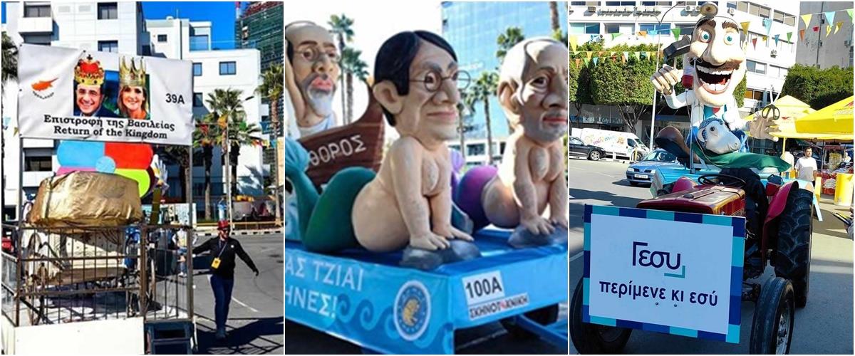 Ανάμεσα στα άρματα, δεν θα μπορούσαν να λείπουν και αυτά που σχετίζονται με την επικαιρότητα και τα φλέγοντα θέματα του τόπου, καθώς υπάρχουν άρματα με τον Πρόεδρο και την Πρώτη Κυρία, την παύση Οδυσσέα Μιχαήλιδη καθώς επίσης και με τον Νίκο Αναστασιάδη.