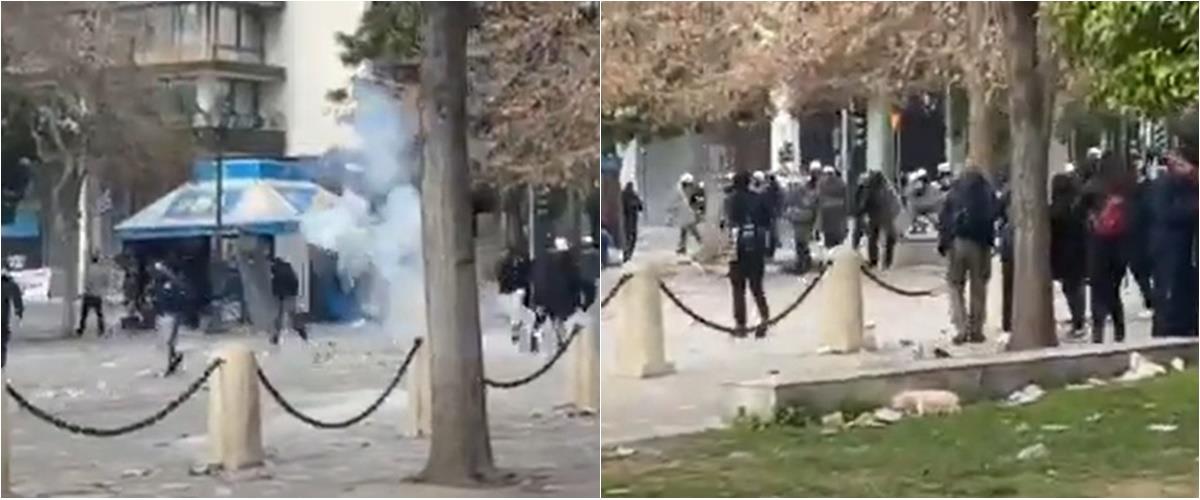 Τα άτομα αυτά φορούσαν κουκούλες και άρχισαν να πετούν βόμβες μολότωφ, πέτρες και μπουκάλια στους αστυνομικούς. Εκείνοι απάντησαν με ρίψεις δακρυγόνων και χημικών.