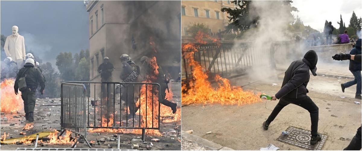 Η αστυνομία συγκρούεται με τους κουκουλοφόρους, οι οποίοι συνεχίζουν να ρίχνουν μολότοφ και να καίνε τους δρόμους γύρω από το Σύνταγμα