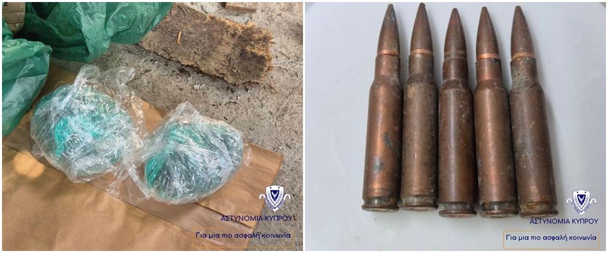 Μετά από αξιολόγηση πληροφορίας, μέλη της ΥΚΑΝ και του Κλάδου Αστυνομικών Σκύλων της ΜΜΑΔ, διενήργησαν έρευνα σε αποθήκη, που διατηρεί ο 34χρονος, σε αγροτική περιοχή στην επαρχία Λευκωσίας. Κατά τη διάρκεια της έρευνας εντοπίστηκαν και κατασχέθηκαν πέντε πλήρη φυσίγγια διαμετρήματος 7,62mm, δύο νάιλον σακούλια, που περιείχαν κάνναβη, συνολικού μεικτού βάρους 1134 γραμμαρίων, ένα δοχείο με μικρή ποσότητα κάνναβης και ένα κινητό τηλέφωνο.