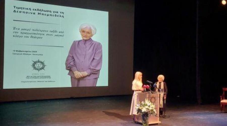 Η εκδήλωση στην οποία παρέστη και η Υφυπουργός Πολιτισμού, Βασιλική Κασσιανίδου, ξεκίνησε με προβολή βίντεο-αφιερώματος για την Δέσποινα Μπεμπεδέλη με αποσπάσματα από την πολυετή και πλούσια πορεία της στη σκηνή.