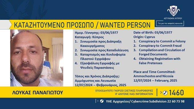 Τη φωτογραφία και τα στοιχεία άντρα ηλικίας 47 ετών, ο οποίος καταζητείται στο πλαίσιο διερεύνησης υπόθεσης πλαστογραφίας συμβολαίων εργοδότησης ποδοσφαιριστών, έδωσε στη δημοσιότητα η Αστυνομία στις 16 Φεβρουαρίου, με σκοπό τη συλλογή πληροφοριών που μπορεί να βοηθήσουν στον εντοπισμό του.