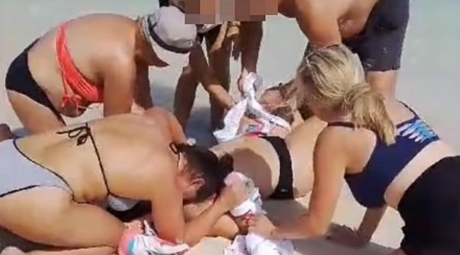 Οι συγκλονιστικές εικόνες δείχνουν πώς ένα πλήθος συγκεντρώθηκε γύρω από την τραυματισμένη γυναίκα αφού κατάφερε να επιστρέψει στην παραλία, με πανιά να κρατούν τα χέρια της, καθώς προσπαθούσαν να σταματήσουν την αιμορραγία.