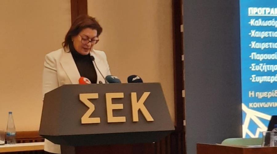 Στον χαιρετισμό της, η Γενική Γραμματέας της ΠΕΟ, Σωτηρούλα Χαραλάμπους, είπε ότι «όταν στεκόμαστε σε ένα σωστό πλαίσιο, μπορούμε να βρίσκουμε λύσεις, οι οποίες να είναι και υπέρ των εργαζομένων αλλά και υπέρ της κοινωνίας. Παράλληλα, επεσήμανε ότι η ημερίδα «ανατρέπει μία αντίληψη που κάποιοι προσπαθούν να περάσουν μέσα στην κοινωνία, ότι το συνδικαλιστικό κίνημα είναι μόνον φορέας διεκδίκησης οικονομικών αιτημάτων και μόνο για τα δικά τους νοιάζονται, όπως επίσης ακόμα μια αντίληψη που συνοδεύει την πρώτη, ότι το συνδικαλιστικό κίνημα είναι φορέας οπισθοδρόμησης και όχι εκσυγχρονισμού».