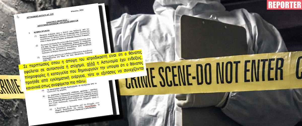 Στην ίδια αστυνομική διάταξη, σύμφωνα με τον κ. Απαισιώτη, υπάρχει και το πρωτόκολλο με τίτλο «ΕΠΙΠΡΟΣΘΕΤΕΣ ΕΝΕΡΓΕΙΕΣ ΣΕ ΠΕΡΙΠΤΩΣΕΙΣ ΑΦΥΣΙΚΩΝ ΘΑΝΑΤΩΝ ΜΕ ΥΠΟΝΟΙΕΣ ΓΙΑ ΕΓΚΛΗΜΑ» όπου αναφέρονται τα ακόλουθα: