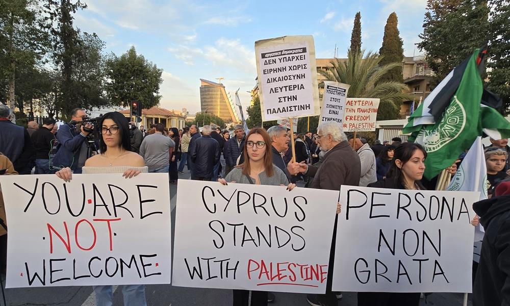Εκδήλωση διαμαρτυρίας πραγματοποιείται έξω από το Προεδρικό Μέγαρο, με αφορμή την επίσκεψη του Προέδρου του Ισραήλ, Ισαάκ Χέρτσογκ, με αποτέλεσμα να κλείσει ο δρόμος.