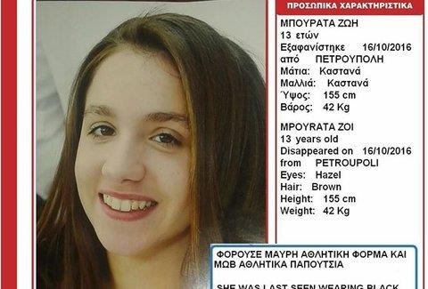 Ήταν γύρω στις 5.30 το απόγευμα της περασμένης Κυριακής, 16 Οκτωβρίου, όταν η 13χρονη Ζωή επέστρεψε στο πατρικό της μετά από επίσκεψη στο σπίτι κάποιας φίλης της. Λίγη ώρα αργότερα ζήτησε από τη μητέρα της να πάει μέχρι το περίπτερο για να αγοράσει ένα κρουασάν. Δεν είχαν περάσει πάνω από δέκα λεπτά όταν τηλεφώνησε στη μητέρα της και της είπε: “Μαμά, βρήκα μια φίλη μου στο δρόμο και θα καθυστερήσω λίγο”. Οι ώρες ωστόσο περνούσαν και η Ζωή δεν επέστρεφε. Οι γονείς της, θορυβημένοι από την πολύωρη απουσία της κόρης τους, δήλωσαν λίγο αργότερα την εξαφάνισή της στις αστυνομικές αρχές ενώ σήμανε Amber Alert. Η Ζωή έχει καστανά μαλλιά, καστανά μάτια, ύψος 155 εκ., βάρος 42 κιλά κι όταν εξαφανίστηκε φορούσε μαύρη αθλητική φόρμα και μοβ αθλητικά παπούτσια.