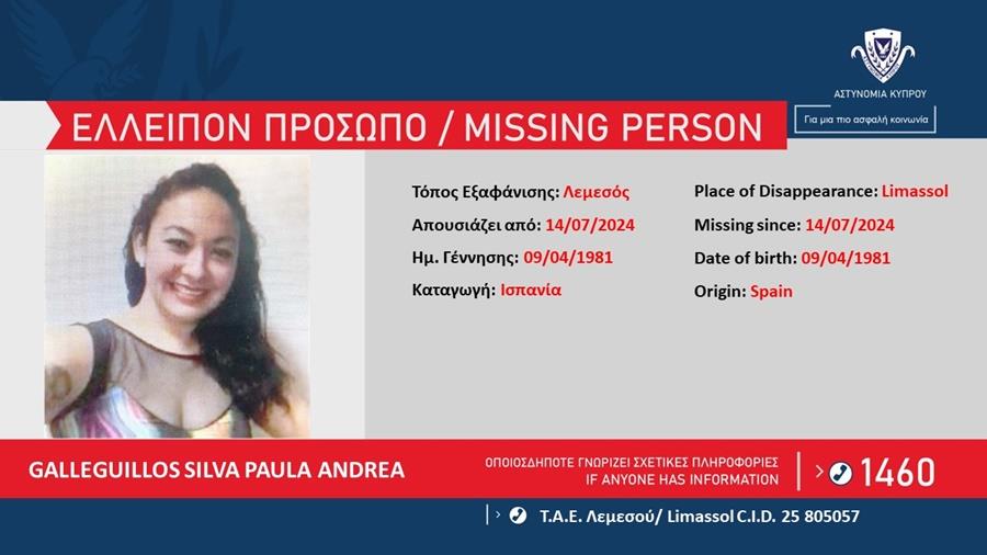 Η Αστυνομία ζητά πληροφορίες, που μπορούν να βοηθήσουν στον εντοπισμό της GALLEGUILLOS SILVA PAULA ANDREA, 43 ετών, από την Ισπανία, της οποίας έχουν χαθεί τα ίχνη, στη Λεμεσό, από τις 14 Ιουλίου 2024.