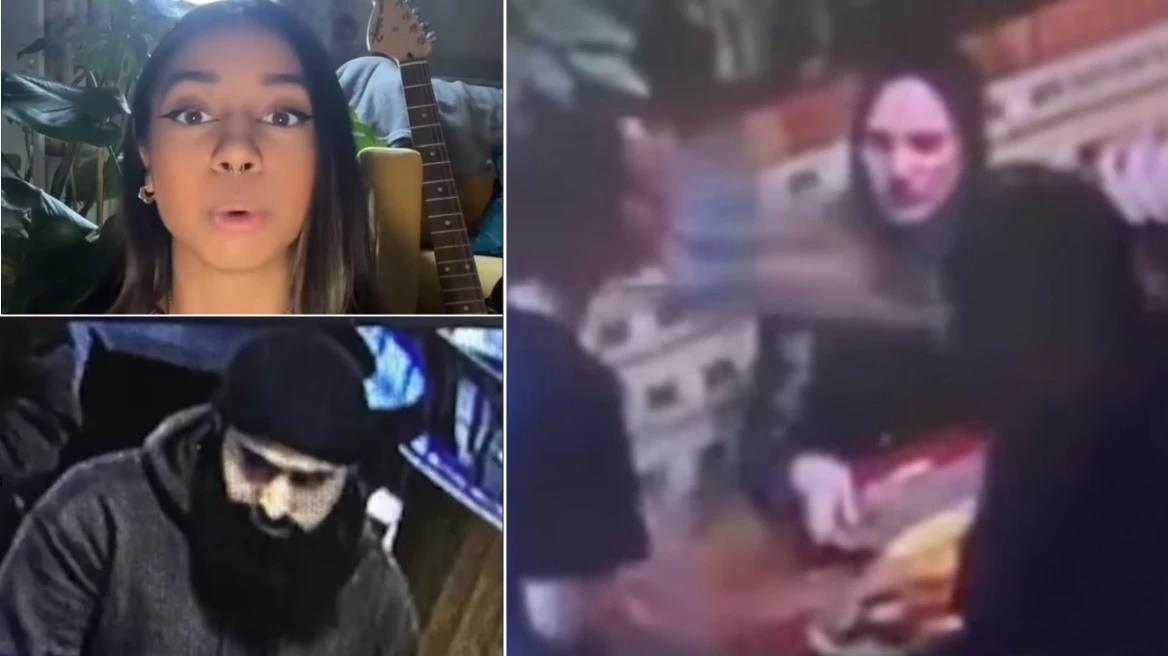 Στο βίντεο από το κλειστό κύκλωμα παρακολούθησης, φαίνεται η σερβιτόρα να πλησιάζει ένα τραπέζι όπου ένας άνδρας με γενειάδα, μαύρο σκουφί και σκούρο φούτερ κάθεται με μια γυναίκα και ένα μωρό. Καθώς η σερβιτόρα τοποθετεί ένα πιάτο με φαγητό στο τραπέζι, ο άνδρας ξαφνικά τη χτυπάει με το πιάτο στο πρόσωπο, ρίχοντάς τη στο έδαφος.
