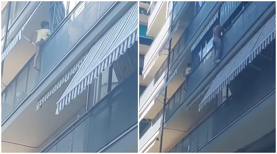 Ένας εξάχρονος κρεμόταν επικίνδυνα από το μπαλκόνι, με το μισό του σώμα να βρίσκεται έξω από τα κάγκελα και το ένα του πόδι να αιωρείται στο κενό. Το παιδί φαινόταν «παγωμένο» από τον φόβο, ενώ οι παρευρισκόμενοι του φώναζαν απεγνωσμένα να επιστρέψει μέσα στο διαμέρισμα.