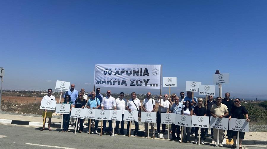 Στη συνέχεια και ο Δήμαρχος και τα μέλη του Δημοτικού Συμβουλίου, κρατώντας πανό που έγραφε «50 χρόνια μακριά σου…» και πλακάτ με τις ενορίες που βρίσκονται στα δημοτικά όρια της κατεχόμενης Αμμοχώστου, φωτογραφήθηκαν με φόντο την κατεχόμενη πόλη.