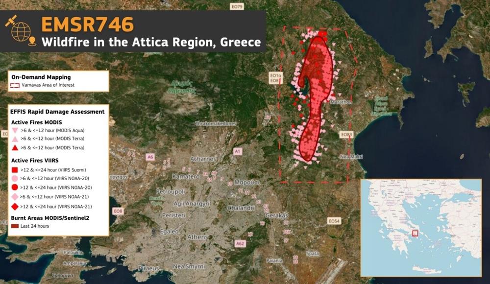 Τα πύρινα μέτωπα που εκτείνονται σε δεκάδες χιλιόμετρα στην βορειοανατολική Αττική καταγράφουν οι δορυφορικές φωτογραφίες από το ευρωπαϊκό σύστημα επιτήρησης Copernicus.