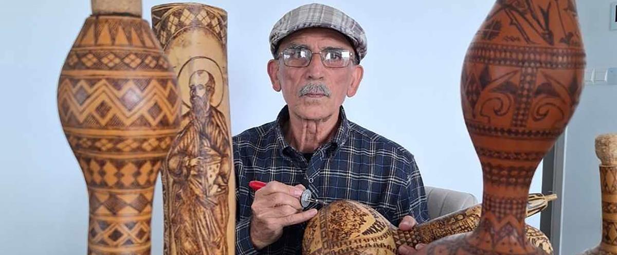 O Γιαννάκης Ιωάννου, συνταξιούχος δάσκαλος με καταγωγή από τα Καμινάρια, ασχολείται με τη ζωγραφική πάνω σε κολοκύθες.