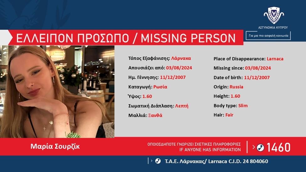 Η Αστυνομία ζητά πληροφορίες που μπορούν να βοηθήσουν στον εντοπισμό της Μαρίας Σουρζίκ, 16 ετών, από τη Ρωσία, η οποία απουσιάζει από την οικία της στην Ορόκλινη, από τις 03/08/2024.