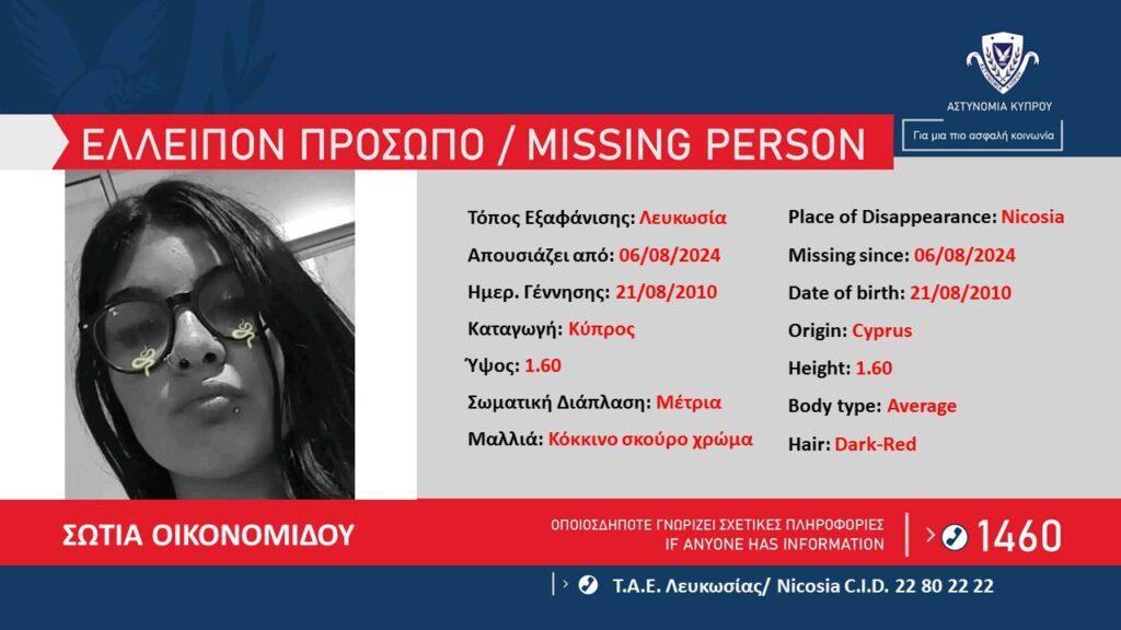 Πρόκειται για την Σώτια Οικονομίδου, ημερομηνία γέννησης 21/08/2010, η οποία ελλείπει από την Τρίτη, 06 Αυγούστου, 2024. Η 13χρονη περιγράφεται ως ύψους 1.60μ. περίπου, μέτριας σωματικής διάπλασης, με σκούρα κόκκινα μαλλιά και μαύρα μάτια. Φέρει σκουλαρίκια στη μύτη και κάτω από τα χείλη της, ενώ κατά την αναχώρηση της φορούσε γαλάζιο με μαύρο χρώμα κολάν, μαύρη αμάνικη φανέλα, και μαύρη ζακέτα.