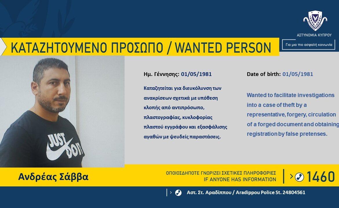 Η Αστυνομία ζητά πληροφορίες που μπορούν να βοηθήσουν στον εντοπισμό του Ανδρέα Σάββα, 43 ετών, κάτοικου Λάρνακας, ο οποίος καταζητείται για διευκόλυνση των ανακρίσεων, σχετικά με διερευνώμενα αδικήματα κλοπής από αντιπρόσωπο, πλαστογραφίας, κυκλοφορίας πλαστού εγγράφου και εξασφάλισης αγαθών με ψευδείς παραστάσεις, που διαπράχθηκαν στη Λάρνακα, μεταξύ Απριλίου – Μαΐου, 2024.