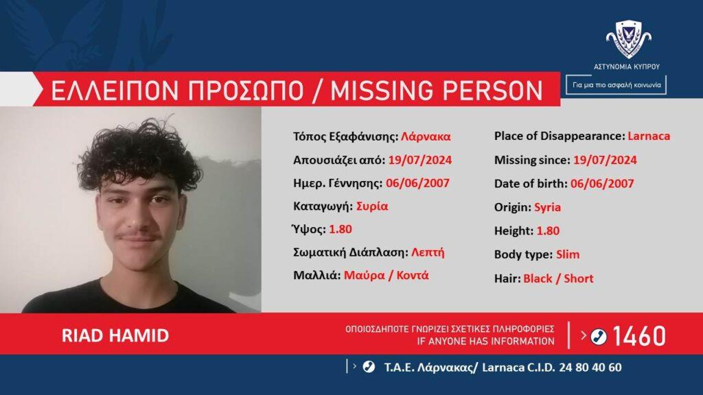 Πρόκειται για τον Riad Hamid, ημερομηνία γέννησης 06/06/2007, από Συρία, ο οποίος ελλείπει από τον χώρο διαμονής του στο χωριό Άγιος Μάμας, στην επαρχία Λεμεσού. Ο 17χρονος περιγράφεται ως ύψους 1.80, λεπτής σωματικής διάπλασης, με μαύρα κοντά μαλλιά, και με μουστάκι.