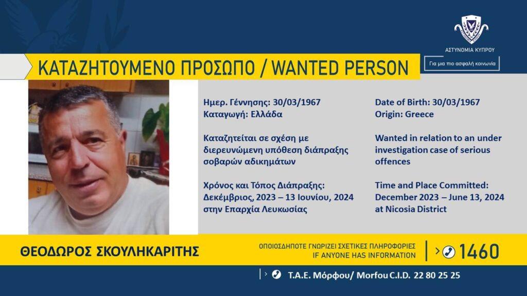Πρόκειται για τον Θεόδωρο Σκουληκαρίτη, ημερομηνία γέννησης 30/03/1967, από Ελλάδα, κάτοικος Κύπρου, εναντίον του οποίου έχει εκδοθεί δικαστικό ένταλμα σύλληψης, για σκοπούς διερεύνησης της υπόθεσης.
