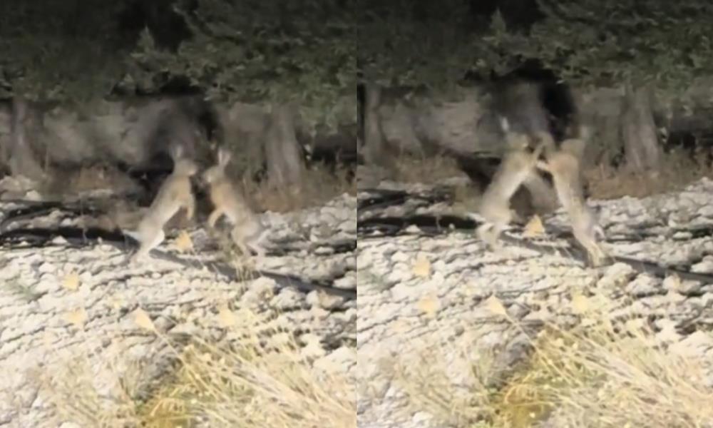 Όπως φαίνεται και στα πλάνα, δύο «μάχιμοι» λαγοί, έχουν σηκώσει μανίκια και κονταροχτυπιούνται με σκοπό ο ένας να κατατροπώσει τον άλλο! Σε κάποια φάση, μάλιστα, ο ένας αρχίζει να τρέχει μακριά για να γλιτώσει με τον δεύτερο να τον κυνηγά από πίσω, ώσπου ξαφνικά χάνονται από το πλάνο…